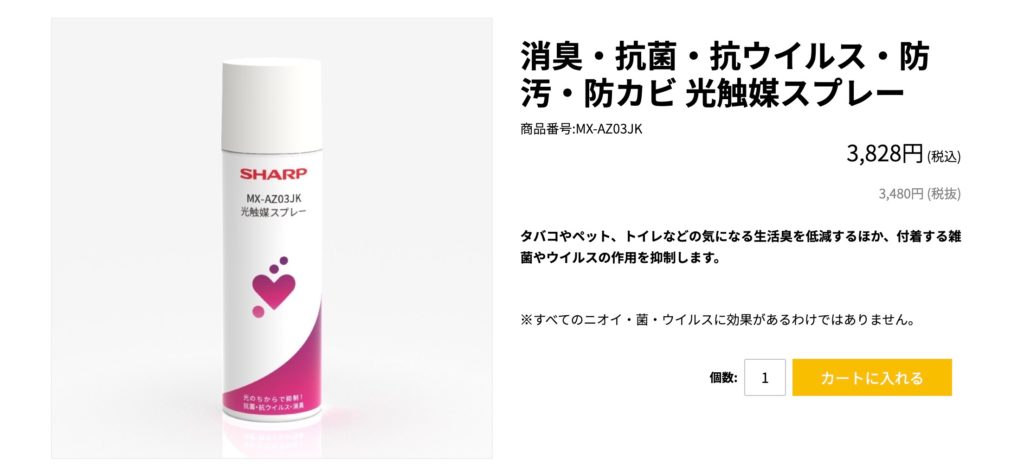 マスクをはじめとした複数の対策グッズがあるが、その中でも自分の利用する周辺のモノに対して簡単手軽に除菌液をスプレーできるアイテムがシャープらか発売されたので早速購入しようとシャープのオフィシャルサイトにいってみた。